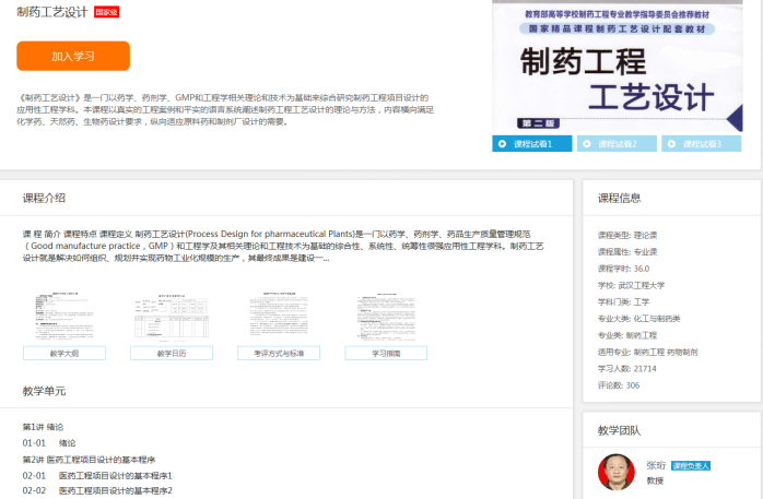 3.底气来自十几年的课程网站建设。2007年张教授带头建设了“国家级精品课程”,2013年又在教育部“爱课程”网站上建设了国家级资源共享精品课程“制药工艺设计”网站,网址为://www.icourses.cn/coursestatic/course_7060.html。近期,他又响应号召在优伦理电影上建设了“制药工艺设计”课程网站,网址为:www.ulearning.cn。