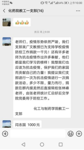 1月28日,学校向全校师生和校友发出接受爱心捐赠的公告,教工一支部书记闫志国教授第一时间响应,在支部微信群发出了“支援打赢疫情防控阻击战”的募捐倡议,号召支部党员同志参加。闫书记带头捐款,吴广文教授连续两次为学校捐款,支部其他党员教师们踊跃参加,人人参与,短短24小时内集善款1.46万元。目前该笔捐款已全部汇至伦理电影