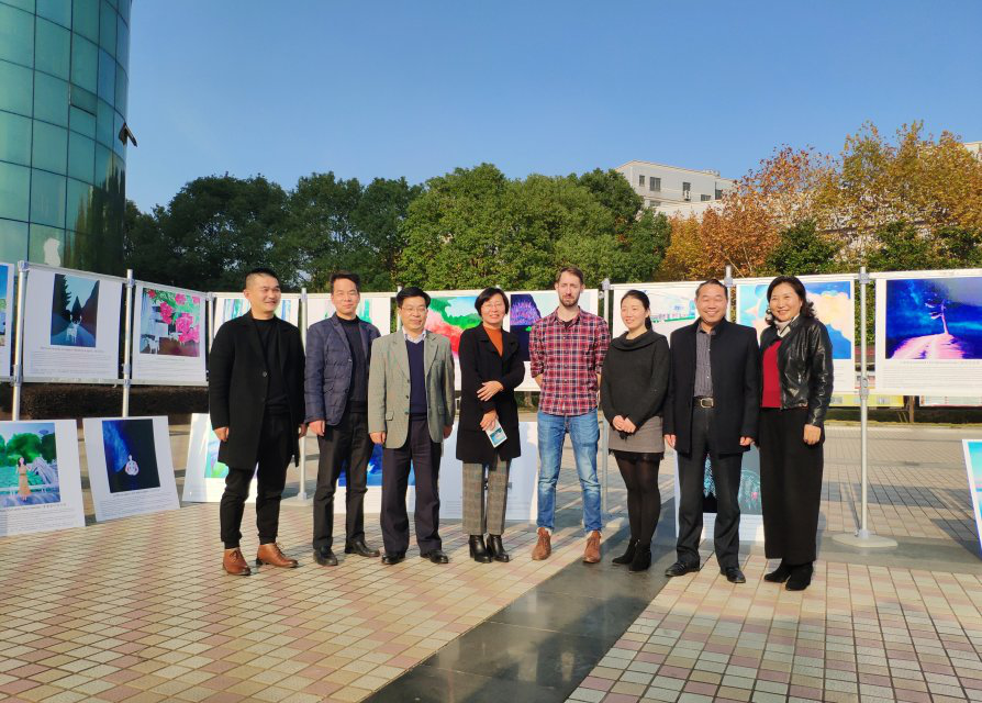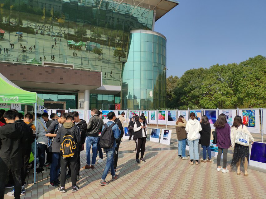 法籍教师Yoann个人画展在流芳校区大礼堂门口举行。校党委副书记郑丹凤,学校组织部、宣传部、人事处的负责人,以及伦理电影